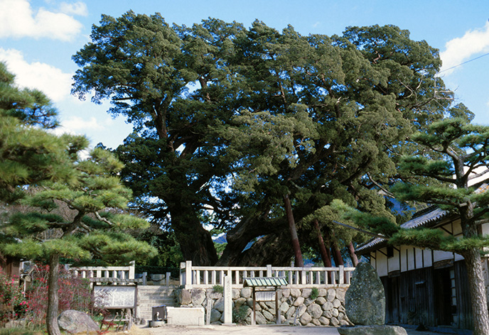 小豆島八十八ヶ所霊場の一つである宝生院。この宝生院のシンボル的な存在が、大きなシンパクです。樹高約16.9m、樹齢は1600年以上、応神天皇が手植えをしたとも伝えられており、長い歴史を感じることができます。