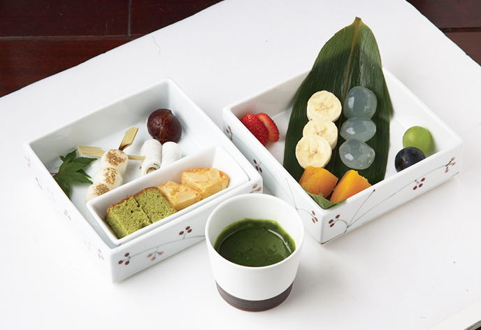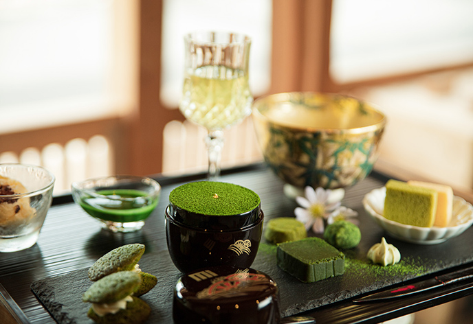 多彩な抹茶スイーツと最高級の抹茶を楽しむことができる贅沢な「抹茶づくし」のティーセット。プレートの中心には、抹茶の粉を入れる茶道具である棗(なつめ)が。蓋を開けると鮮やかな抹茶の緑が目に映り、中身は抹茶ムースを使ったケーキになっています。