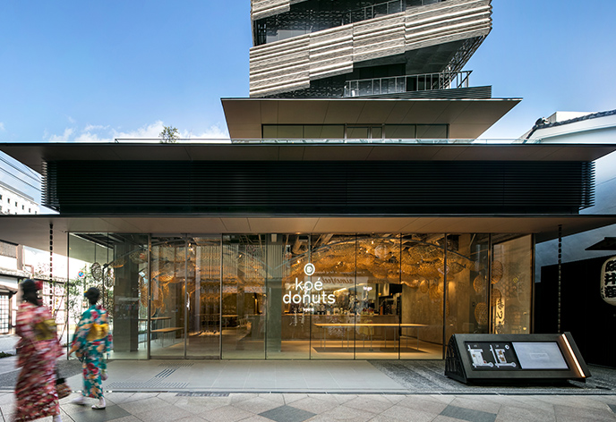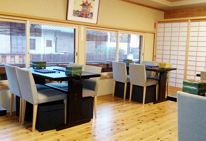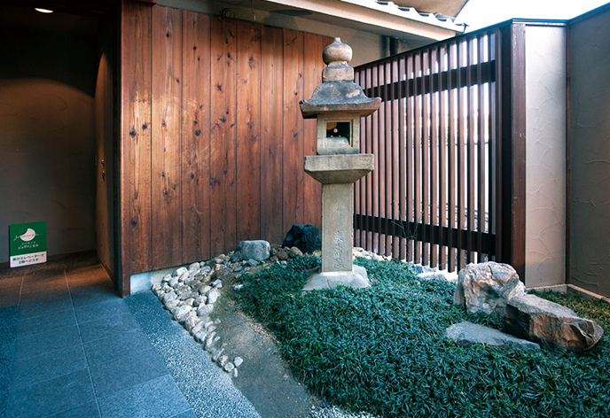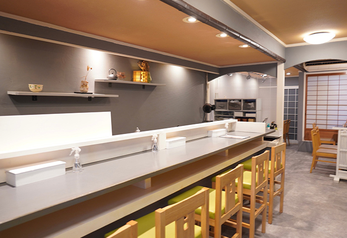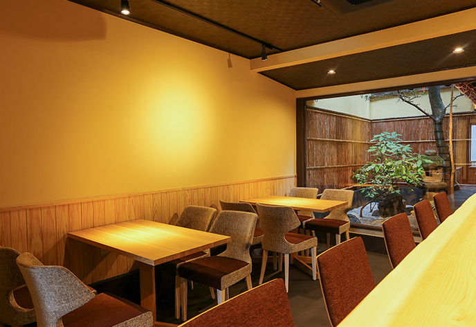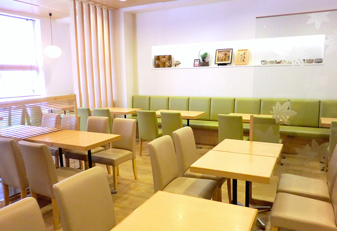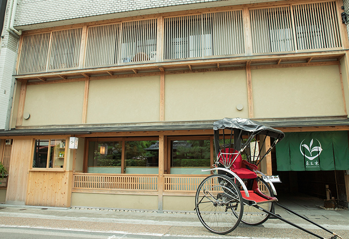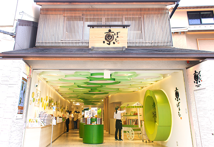 京都の中心地、四条河原町交差点のすぐ近く、ビルの4階にあり、町の喧噪を気にすることなく、お茶&スイーツをお楽しみいただけます。玉じゃりを配したエントランスの先には、かえで柄入りのパーティションと、抹茶とほうじ茶色をイメージしたお席がお客様をお迎え。京都にお越しいただく多くの皆様に“ホッと一息”、和みとくつろぎのひとときをお過ごしいただけます。