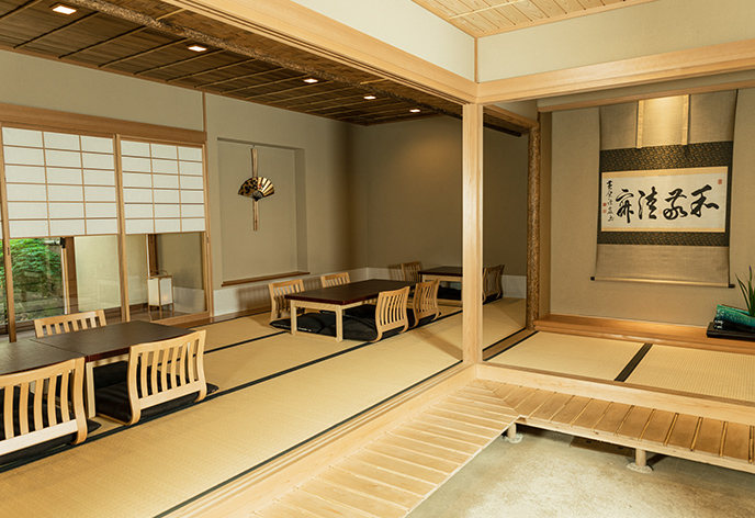 茶三楽では、伝統を大切にしながらも、抹茶碗で楽しむエスプーマかき氷、上質な抹茶スイーツなど、新しい抹茶の魅力を楽しめる商品もご用意しています。 和室の天井や床の間、和室から臨むことができる坪庭など、茶室の要素を取り入れたしつらえは趣向を凝らした空間になっています。先人たちの知恵を借りたおもてなしでお客様をお迎え、慌ただしい現代を過ごすすべての方へ「こころが豊かになるお茶」をお届けします。