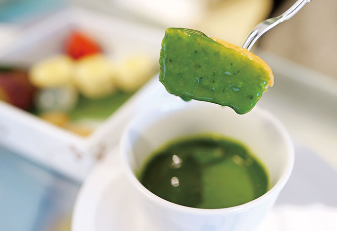 あたたかい抹茶チョコレートソースに、フルーツやお団子、焼き菓子をフォンデュしてお召し上がりいただきます。