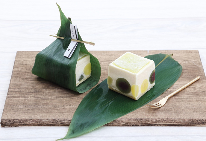 笹の葉に包まれた真っ白なレアチーズケーキは、北海道産クリームチーズを贅沢に使用。天面には求肥をあしらい、中にはよもぎと柚子を使った大福餅が入っています。
