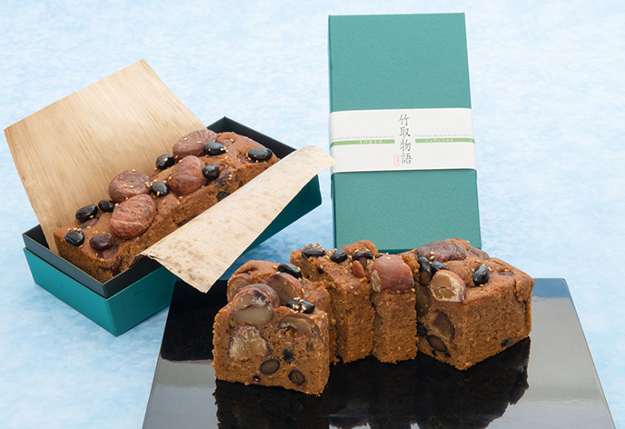 ジュヴァンセルの代表商品として多くの方に親しんでいただいている「竹取物語」は2000年の節目に「竹」をテーマに生まれました。和栗・黒豆を贅沢に使い、竹の皮に包まれたパウンドケーキは和と洋が融合したまったく新しいお菓子です。