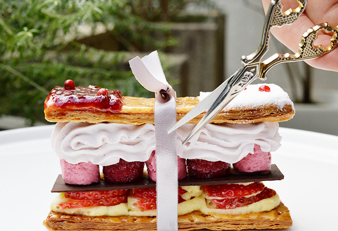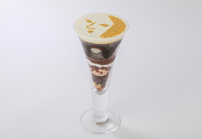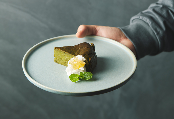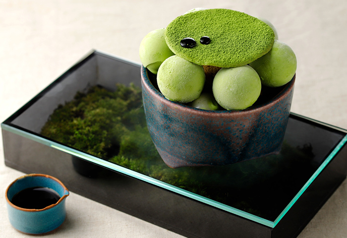 繊細な苔の表情が楽しめるトレーや、京都 清水焼の器を使った盛り付けが印象的な「京の盆栽」。抹茶チュイルの下には、自社のアイスクリーム工房で作る抹茶アイス、ふわふわの黒糖ジェノワーズやもちっとした白玉、お麩ショコラや抹茶ゼリー、自家製の餡子など多彩な美味しさが詰まっています。スプーンでくずした抹茶チュイルに黒蜜をかけて、宇治抹茶の濃厚な美味しさをご堪能ください。