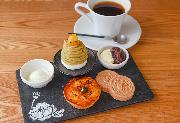 旬のフルーツをふんだんに盛り付けた”やま”シリーズのパフェや、清水焼のプレートに本物の苔を敷き詰めた食器が独創的な”京の盆栽”など、おもわず写真に撮りたくなるような商品を取り揃えています。美味しくて、楽しいひとときをお過ごしください。