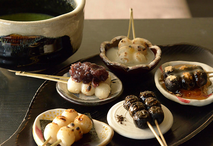 平安王朝時代の襲色目にあやかった色彩と、三種類のもち米粉を独自の比率で組み合わせたもちっとした生地が特徴です。自家製こし餡と粒餡、黒豆から挽いたきな粉に京都の白味噌を加えた白味噌きな粉餡の3種類からお楽しみください。