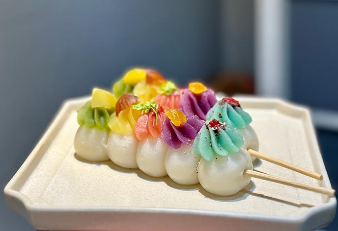 白玉団子に3色の餡がのった見た目もカラフルでとても可愛らしいです。