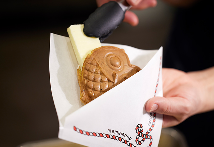 看板商品の「賞味期限1分 あんバターたい焼き」は出来立て熱々のたい焼きの背中をカットし、そこに氷でキンキンに冷やしたバターを大きな塊のままお客さまの目の前で差し込みます。