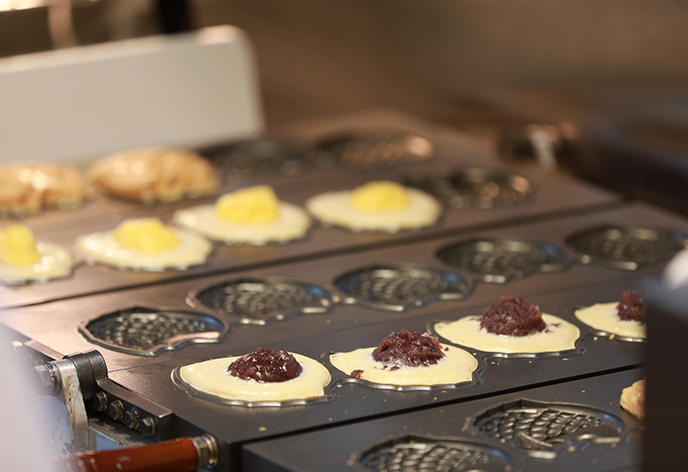 使用しているバターは特別に注文している「北海道日高バター」。その大きな塊りの中心部分だけを贅沢使いしており、フレッシュでミルキーな味わいを極限まで引き出しています。つぶあんはイマムラ謹製、生地には最高級の薄力粉「特宝笠」を使用。