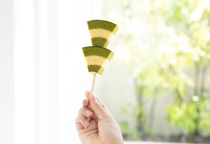 看板商品の京ばあむは、こだわりぬいた素材を使用したバームクーヘンで、熟練の職人による手仕事でていねいに焼き上げています。京都産の宇治抹茶、京都の地下水で仕込んだ豆乳、国産100%の小麦粉を使用しており、しっとりとした口溶けと、抹茶の香りが特徴的です。