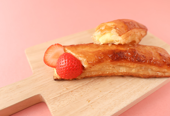 外側はパリパリ、中にはとろっと自家製カスタードが入った片手で楽しめる短冊型の細長いパイです。いちごが乗っていて大満足です。