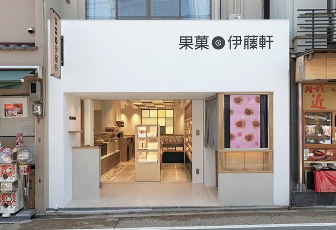 果菓 伊藤軒(かか いとうけん)があるのは、千本鳥居で有名な伏見稲荷大社参道のすぐ近く。元治元年(1864年)に京都で創業し、時代に合わせた多彩な和菓子ショップやカフェを展開する伊藤軒の店舗の1つです。
