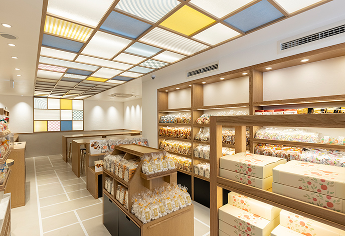 店内には、おかきやどらやき、飴など、昔ながらの伊藤軒のお菓子が並んでいます。伝統的なお菓子ながら可愛らしいデザインの包装のものが多く、思わず手に取りたくなるものが揃っています。