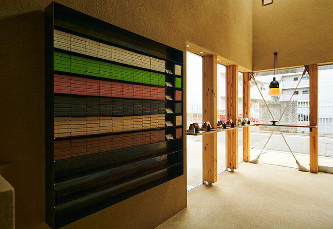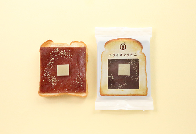 新しいかたちの和菓子として大ヒット中の「スライスようかん」。丹波大納言小豆の粒あん羊羹に、沖縄の塩を効かせたバター羊羹と、ケシの実をトッピングしています。