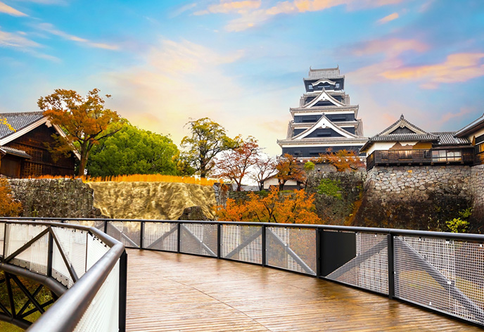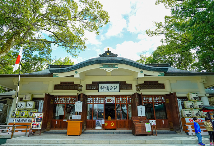 熊本城の築城及び熊本の発展に尽力した、加藤清正公を主祭神として祀る加藤神社。熊本城を訪れた際にはぜひ参拝しておきたいスポットです。境内からは熊本城の迫力ある姿を間近で見ることができ、記念撮影スポットとしても人気があります。文禄の役の記念に清正公が持ち帰ったとされる「太鼓橋」、同じく文禄の役の記念として肥前名護屋城より移された「清正公の旗立石」、熊本城築城の際に清正公がお手植えされた銀杏の樹など見どころがたっぷり。4月には盛大な御幸行列が見られる「せいしょこまつり」が開催され、地元の人々や多くの観光客で賑わいます。