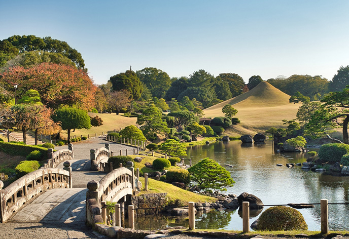 1632年に初代熊本藩主となった細川忠利は、清らかな湧水の出る水前寺の地を気に入り、「水前寺御茶屋」を建てました。これが水前寺成趣園のはじまりといわれ、その後の藩主によって壮大かつ華やかな回遊式庭園が造られたとされています。