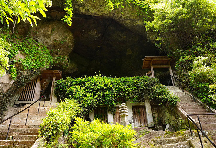 霊巌洞は、熊本市西部の金峰山の麓にある洞窟です。九州西国三十三観音第14番霊場である曹洞宗の寺・雲巌禅寺の裏山にあり、洞窟内では岩戸観音と呼ばれる観音像を見ることができます。かつて岩戸観音を異国から運ぶ際に、舟は転覆したものの観音像だけが板にのって流れ着いたという言い伝えも。宮本武蔵は、晩年にこの洞窟で「五輪書」を書いたとされ、武蔵ファンにとっては外せないスポットです。