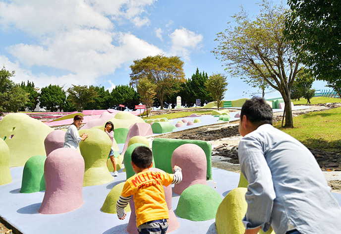 阿蘇くじゅう国立公園内にある「阿蘇ファームランド」は、自然と触れ合いながら健康のすばらしさを体感できるテーマパーク。日帰りエリアの「阿蘇元気の森」と、宿泊エリアの「大自然阿蘇健康の森」の2つのエリアに分かれています。日帰りエリアでは、体と頭脳をフル活用して挑む大自然融合体感型の運動施設や、35種類もの動物が勢揃いする「ふれあい動物王国」などの施設が充実しており、お子様も存分に楽しめます。一方、宿泊エリアにはドーム型の客室がズラリと建ち並び、非日常的な雰囲気満点。温泉やこだわりの料理をゆったりと堪能できます。