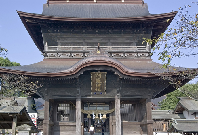 紀元前282年創立、2000年以上の歴史を誇る阿蘇神社は、肥後の国一の宮として古くから崇められてきました。全国に500社ある阿蘇神社の総本社であり、季節を問わず多くの参拝客で賑わいを見せています。阿蘇神社の社殿群のうち、神殿や楼門などは国の重要文化財にも指定されており、中でも圧巻の規模を誇る楼門は「日本三大楼門」のひとつとして知られています。