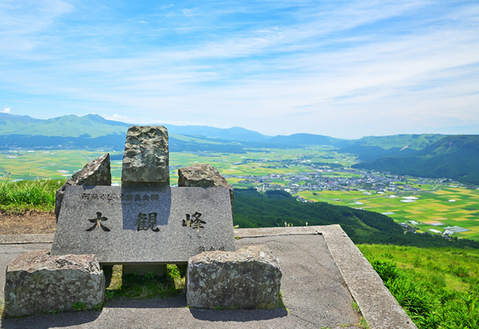 大観峰は、標高約935mの北外輪山の一峰で、阿蘇でも有数の展望スポットとして知られています。眼下には阿蘇の街並み、遠くには阿蘇五岳やくじゅう連峰が広がり、雄大な風景を360度どこからでも楽しむことができるのが人気の理由です。秋から冬のはじめにかけては早朝に雲海を見られることもあり、その幻想的な景色を一目見ようと多くの観光客が訪れます。また、夜景や日の出の美しさも格別なので、阿蘇に宿泊する際はぜひ夜や早朝に足を運んでみてはいかがでしょうか。