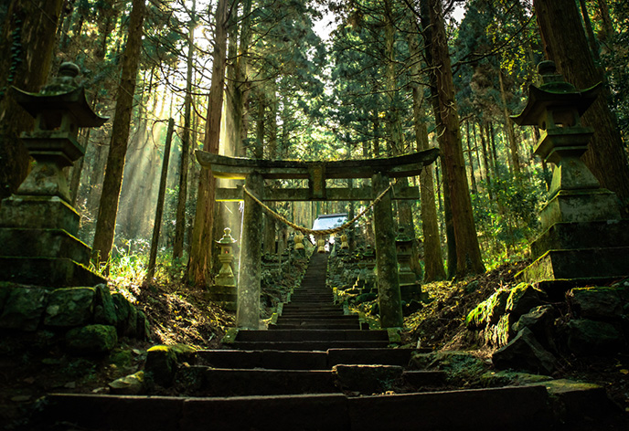 高森町の四大熊野座神社のひとつとして知られる上色見熊野座神社。鎌倉時代末期から室町時代に創建されたといわれ、2011年にアニメ「蛍火の杜へ」の舞台となったことがきっかけで多くの観光客が訪れる名所となりました。参道には97基もの石灯籠が並んでおり、奥へと進むほどに深い緑と静寂に包まれ、まるで異世界への入り口のように感じられます。さらに社殿の奥へと坂を登っていくと、鬼八法師が阿蘇大明神に追われた際に蹴破ったと伝わる大風穴「穿戸岩」を見ることができます。ぜひその神秘的な空気を肌で感じてみてはいかがでしょうか。