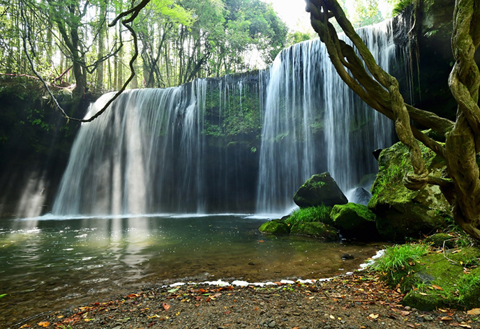 世界ジオパークとして認定されている広大なカルデラ「阿蘇ジオパーク」の中でも、神秘的なスポットして人気の高い鍋ヶ滝。約9万年前の巨大噴火によって阿蘇のカルデラが作られた際に、鍋ヶ滝が誕生したといわれています。高さ約10m、幅約20mの滝は、まるでレースカーテンのように繊細かつ優美な印象。木漏れ日に照らされる滝を間近で見ることができ、マイナスイオンを感じながら日々の疲れを癒すことができます。