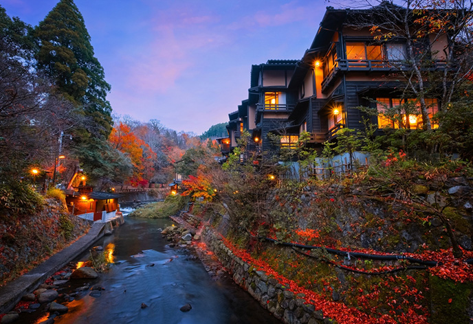 阿蘇から更に奥地へと進み、大分県との境に位置する「黒川温泉郷」。江戸時代中期から秘境の湯治場として知られていましたが、全国区の温泉郷となったのは1990年代頃からです。黒川温泉街に建ち並ぶ30軒の宿と、美しい里山の景色をひとつの旅館のように考える「黒川温泉一旅館」をコンセプトとしているのが特徴。まるで渡り廊下を通って離れに向かうような感覚で、温泉街を楽しむことができます。