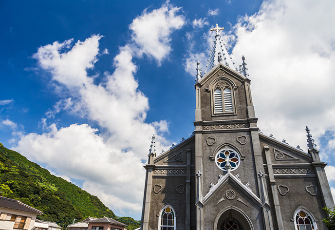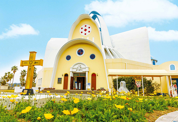 世界文化遺産である「天草の﨑津集落」の中にある﨑津教会は、戦国時代に領主の天草氏がキリスト教布教を許したことで建てられました。1638年の禁教令以降、絵踏みなどの厳しい弾圧が行われた中でも、この地の人々は潜伏キリシタンとして信仰を続けてきたとされています。現在の教会は1934年に再建されたもので、尖塔に十字架を掲げたゴシック様式の教会でありながら、内部は畳敷きという珍しい造りになっているのが特徴です。ステンドグラスの美しい光に包まれながら、天草の文化と歴史を肌で感じることができるスポットです。拝観を希望する場合は、事前予約が必要なのでご注意ください。