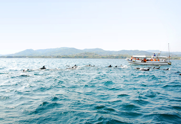 天草五和沖合には、約300頭もの野生のミナミハンドウイルカが生息しています。天草イルカウォッチング受付予約センターでは、そんな野生イルカが泳ぎ回る姿を間近に見られる船旅を開催しています。イルカに出会える確率はなんと98%。イルカが船のすぐそばまで近づく様子や、群れで船の横を一緒に泳ぐ様子、大ジャンプをする様子などを見られる迫力満点のイルカウォッチングは、一生の忘れられない思い出になります。子供も乗船できるので、ご家族での体験も可能です。また、約60分の船旅では、日本有数の活火山である雲仙普賢岳の絶景を眺めることもできます。