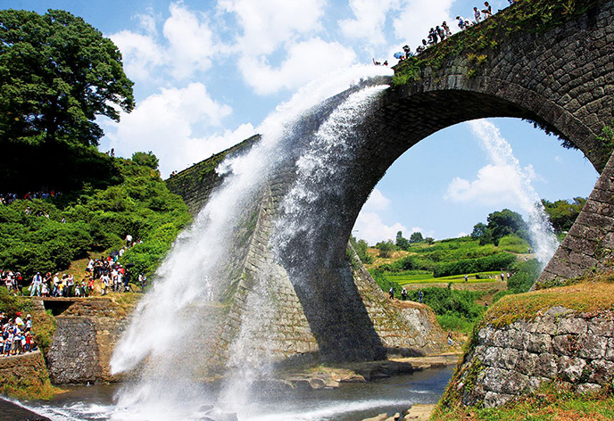 熊本県の中央、上益城郡山都町にある通潤橋は、水不足に悩まされていた白糸大地に農業用水を引き込むために、1854年に布田保之助の計画によって建設されました。長さ約78m、高さ約21.3m、放水が可能な国内唯一の石造アーチ橋であり、2023年には国宝にも指定されています。