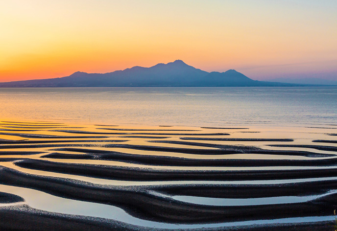 有明海に面する御輿来海岸は、古くから伝わる景勝地のひとつ。その美しさは、ヤマトタケルノミコトの父とされる景行天皇が、御輿来海岸の景色に目を奪われ御輿を止めたという言い伝えもあるほどです。現在では、日本の渚百選・日本の夕陽百選にも選定されています。