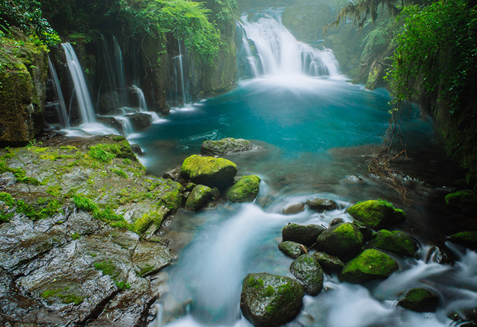 阿蘇外輪山の北西に位置する菊池渓谷は、約1,193haもの広さを有する憩いの森。日本森林浴の森百選、日本の滝百選などにも選ばれています。豊かな原生林と澄んだ渓流が織りなす景観は、訪れた人の目や耳、心を癒してくれます。渓谷沿いには遊歩道があり、時を忘れてゆったりと散策できるのが魅力。春は若葉、夏は清流と木陰、秋は紅葉、冬は白銀の世界と、四季折々の表情を楽しめるので、何度訪れても飽きることのないスポットです。