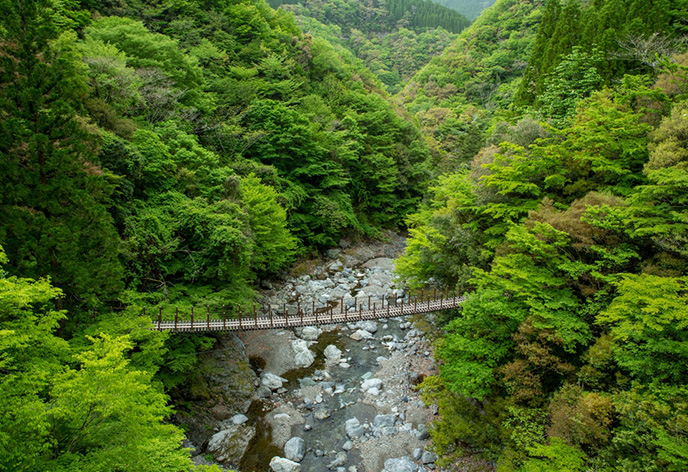 九州中央山地の奥深く、宮崎県との境に位置する「五家荘」は、八代市泉町の5つの地域(久連子・椎原・仁田尾・葉木・樅木)の総称です。かつて壇ノ浦の戦いに敗れた平家が隠れ住んだとされる、険しい谷と手付かずの自然に囲まれた秘境。70mもの落差のある迫力満点な「せんだん轟の滝」や、スリルを味わいながら渓谷美を眺めることができる「樅木の吊橋」など、大自然を体感できるスポットが豊富です。紅葉の名所でもあり、秋には特に多くの観光客が訪れます。五家荘はとても広く山道も険しいので、車での移動がおすすめです。